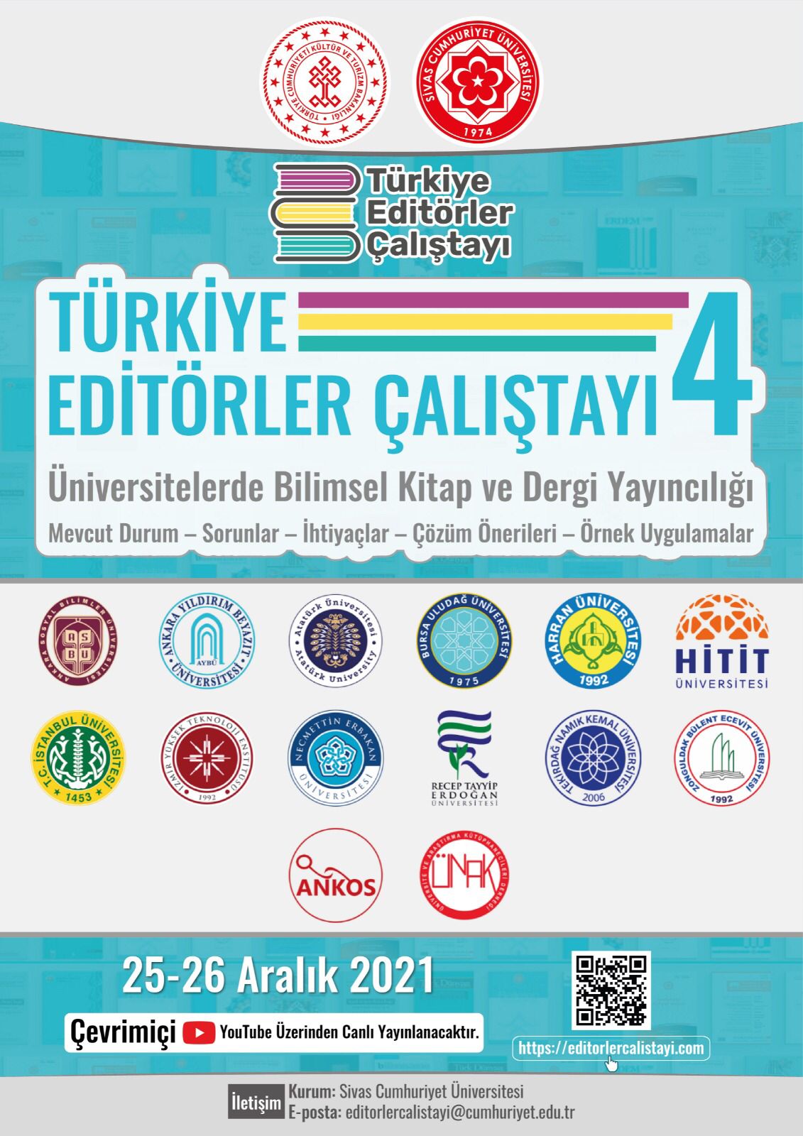 Editörler Çalıştayı’nın 4 üncüsü, 25-27 Aralık 2021 tarihlerinde çevrim içi olarak gerçekleştirilecektir. Çalıştayın teması, editörlerle yapılan istişareler sonunda “Üniversitelerde Bilimsel Kitap ve Dergi Yayıncılığı: Mevcut Durum – Sorunlar – İhtiyaçlar – Çözüm Önerileri – Örnek Uygulamalar” şeklinde belirlenmiştir.